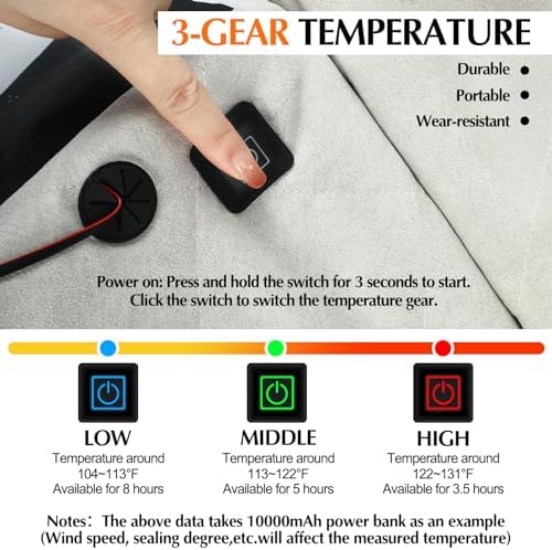 3 Levels Temperature Design: the heated seat cushion has 3 levels of temperature that can be adjusted according to needs, including low temperature: 122 ℉/ 50 ℃, medium temperature: 138.2 ℉/ 59 ℃ and high temperature: 149 ℉/ 65 ℃, keeping warm in cold weather